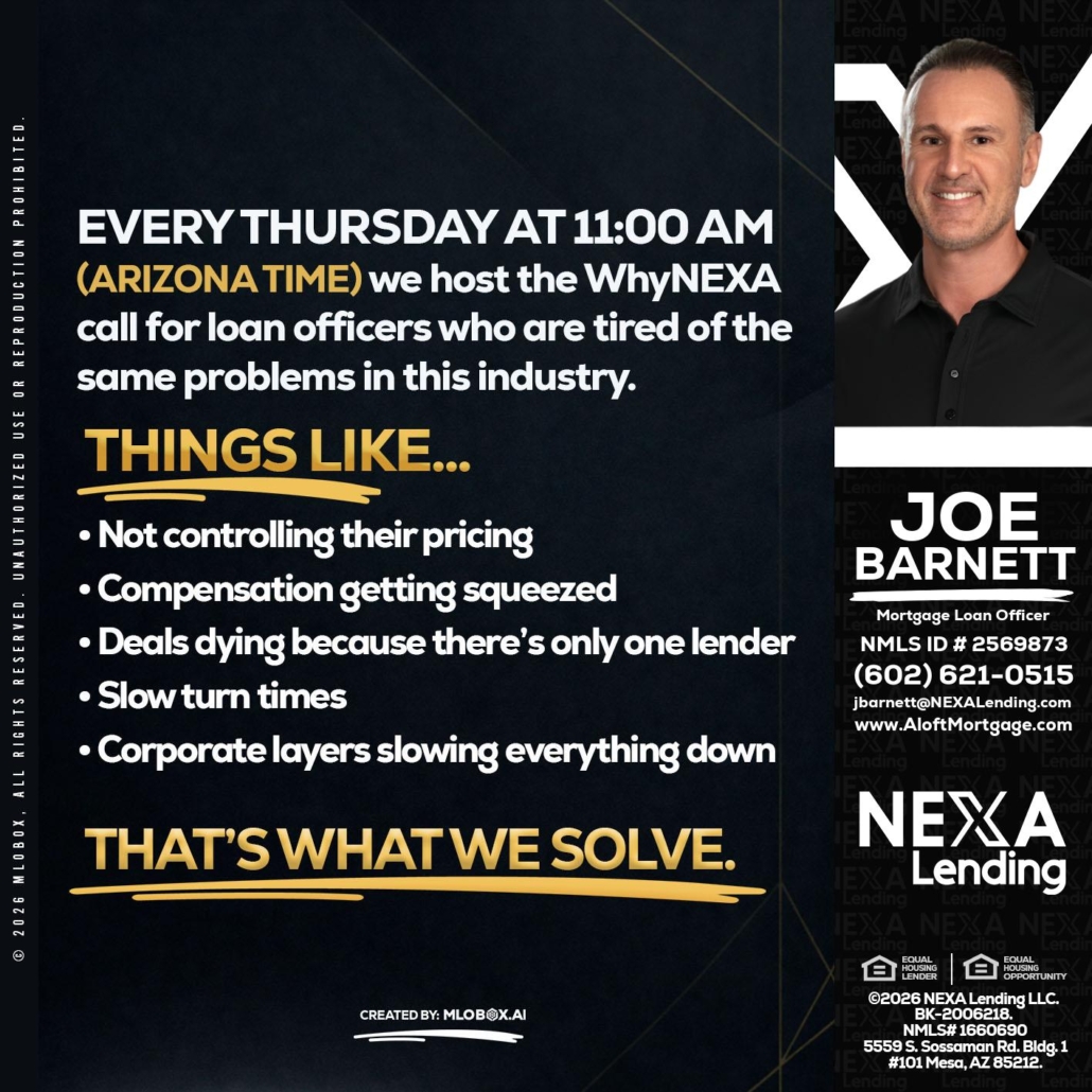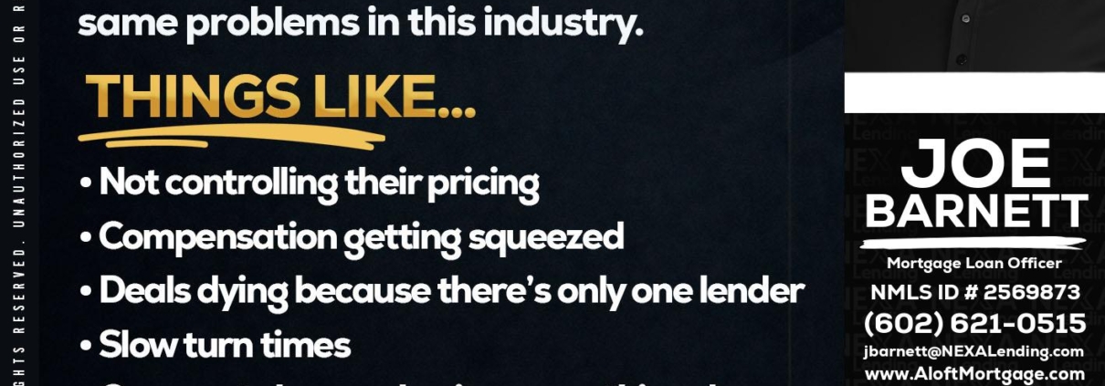 Hi, my name is Joe Barnett. I’m a Loan Officer with NEXA Lending LLC., offering personalized mortgage solutions, fast customized quotes, great rates and service with integrity.