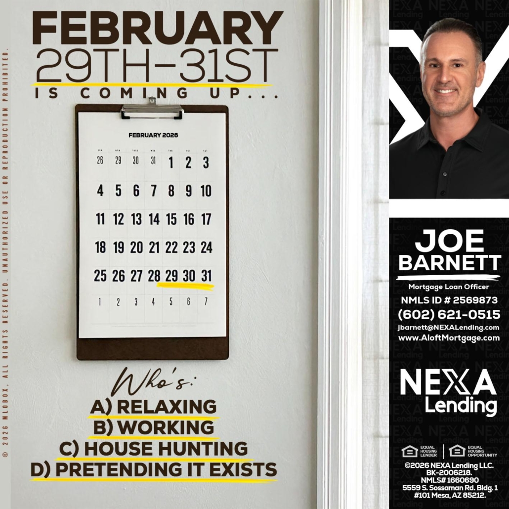FEBRUARY 29-31 - Joe Barnett -Mortgage Loan OfficerHi, my name is Joe Barnett. I’m a Loan Officer with NEXA Lending LLC., offering personalized mortgage solutions, fast customized quotes, great rates and service with integrity.
