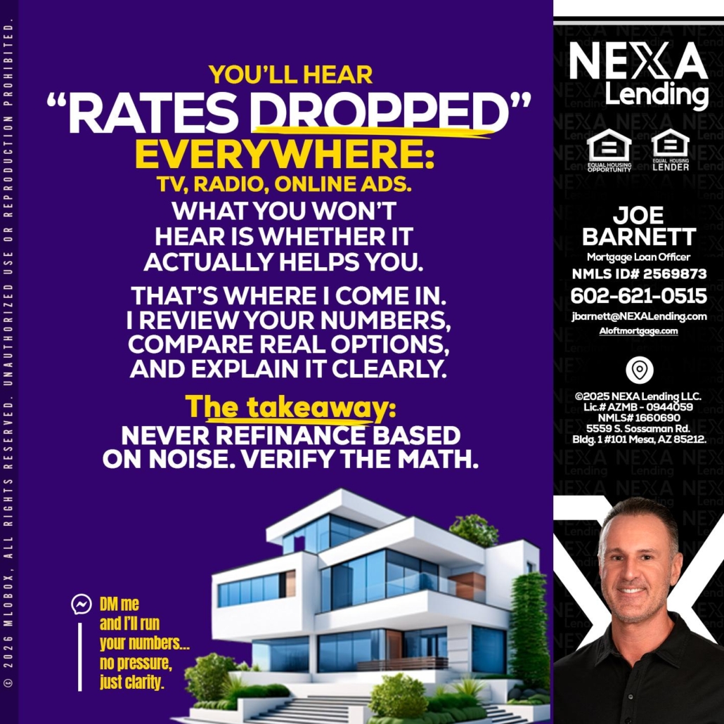 RATES DOPPED - Joe Barnett -Mortgage Loan OfficerHi, my name is Joe Barnett. I’m a Loan Officer with NEXA Lending LLC., offering personalized mortgage solutions, fast customized quotes, great rates and service with integrity.