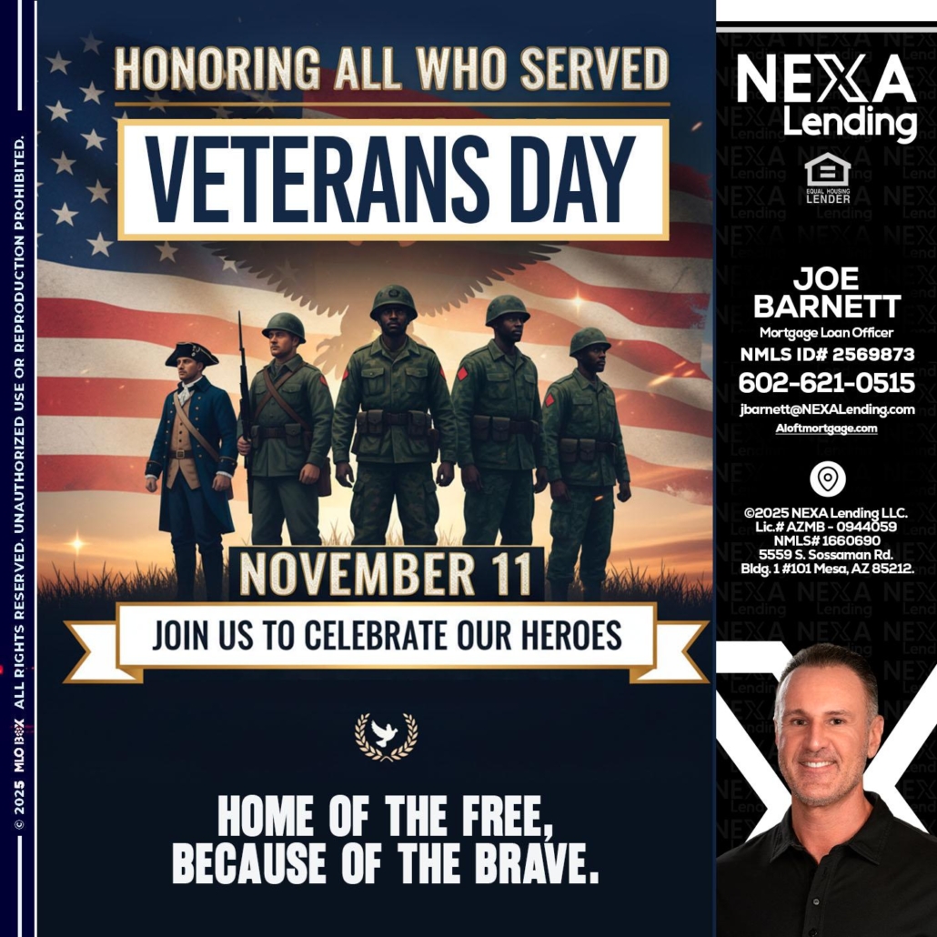 VETERANS DAY - Joe Barnett -Mortgage Loan OfficerHi, my name is Joe Barnett. I’m a Loan Officer with NEXA Mortgage LLC., offering personalized mortgage solutions, fast customized quotes, great rates and service with integrity.