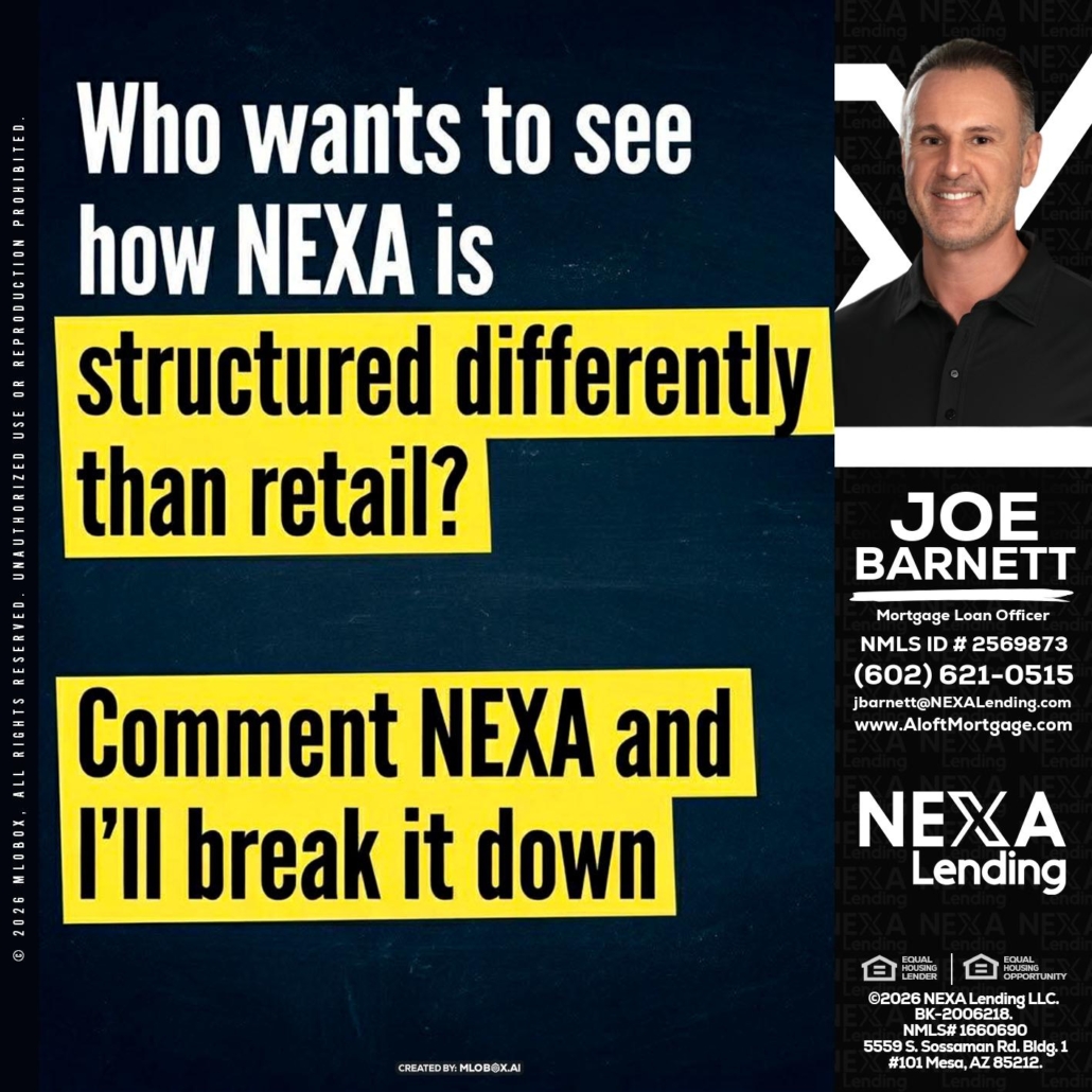 Hi, my name is Joe Barnett. I’m a Loan Officer with NEXA Lending LLC., offering personalized mortgage solutions, fast customized quotes, great rates and service with integrity.